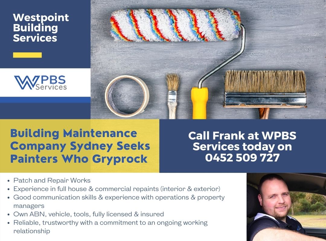 We are a Building Maintenance, Property Maintenance & renovation company servicing the Western Suburbs and Sydney City CBD areas. We continue to expand and grow further Outer West of Sydney as well. As we grow, we are seeking experienced, qualified & insured painters who can also gyprock who are Building and Property Maintenance tradespeople. MUST have *ABN* & be registered as a legitimate business, to work with WPBS Services on a job by job, contract by contract basis.